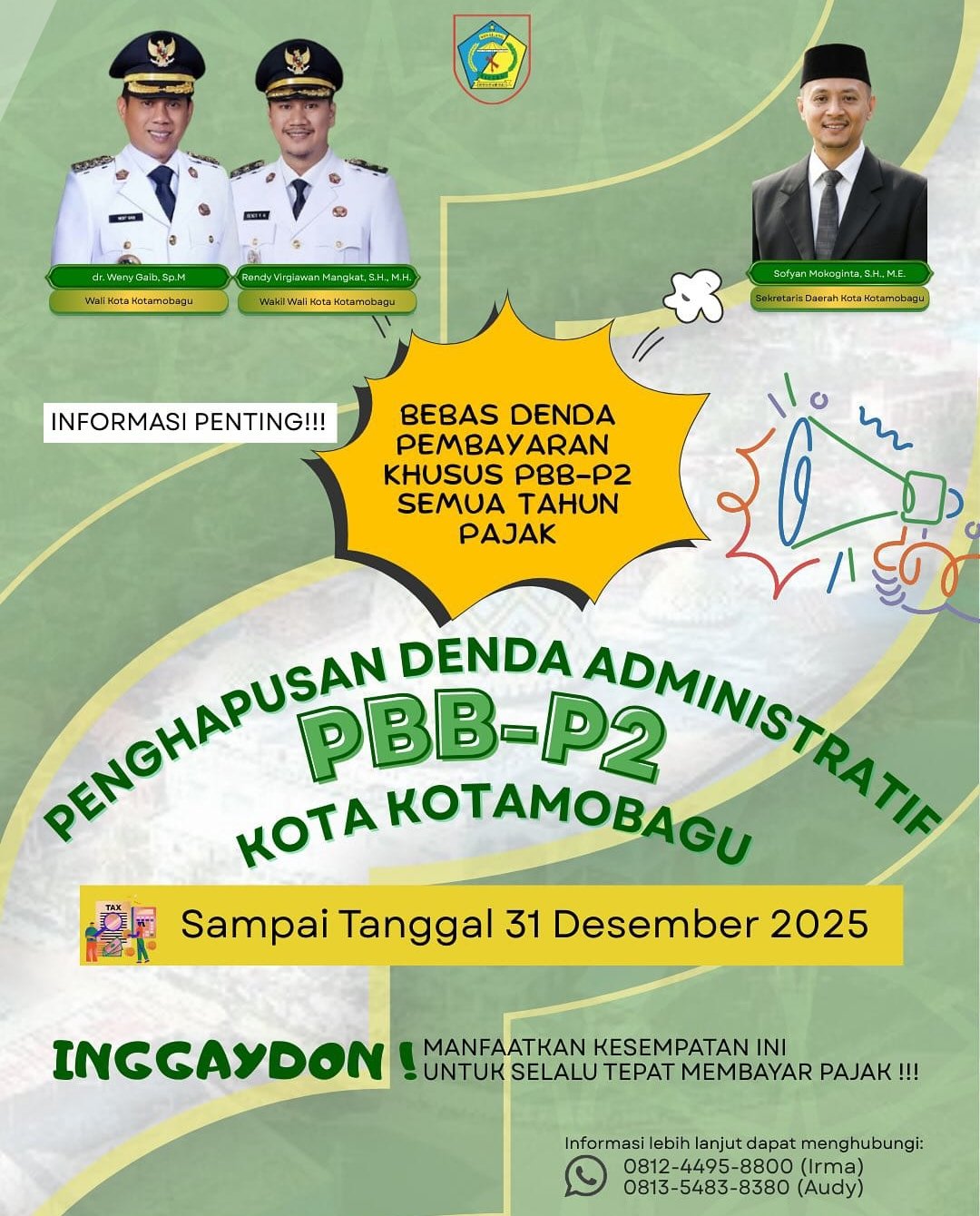 “Pemerintah Daerah Kota Kotamobagu memberikan kesempatan kepada seluruh wajib pajak di Kota Kotamobagu untuk melakukan pembayaran Pajak Bumi dan Bangunan tanpa dikenakan denda administrasi. Kebijakan penghapusan PBB ini berlaku hingga tanggal 31 Desember 2025,” ujarnya.