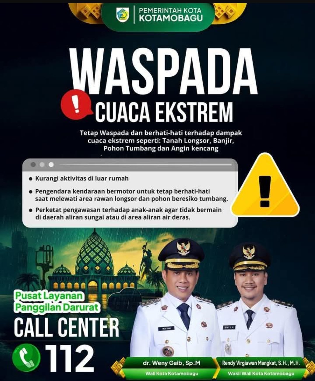 KOTAMOBAGU – Pemerintah Kota Kotamobagu di bawah kepemimpinan Wali Kota dr. Weny Gaib, Sp.M, dan Wakil Wali Kota Rendy V. Mangkat, SH, MH, menyampaikan himbauan peringatan kepada masyarakat untuk meningkatkan kewaspadaan terhadap potensi cuaca ekstrem yang dapat memicu bencana alam.