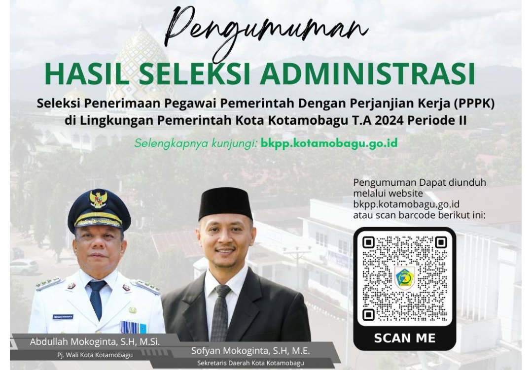 Pengumuman ini berdasarkan Pengumuman Nomor 25/813/PANSEL-PPPK/II/2025 tentang Hasil Seleksi Administrasi Pengadaan Pegawai Pemerintah dengan Perjanjian Kerja di Lingkungan Pemerintah Kota Kotamobagu Tahun Anggaran 2024 Tahap II.