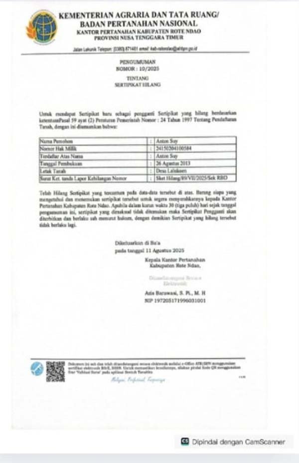 Kepala Kantor Pertanahan Kabupaten Rote Ndao, Azis Barawasi, S. Pt., M.H., menjelaskan, “Kami mengimbau kepada masyarakat untuk berpartisipasi aktif dalam pencarian sertifikat ini. Jika dalam waktu yang ditentukan sertifikat tidak ditemukan, kami akan segera memproses penerbitan sertifikat pengganti agar hak atas tanah tetap terlindungi.”