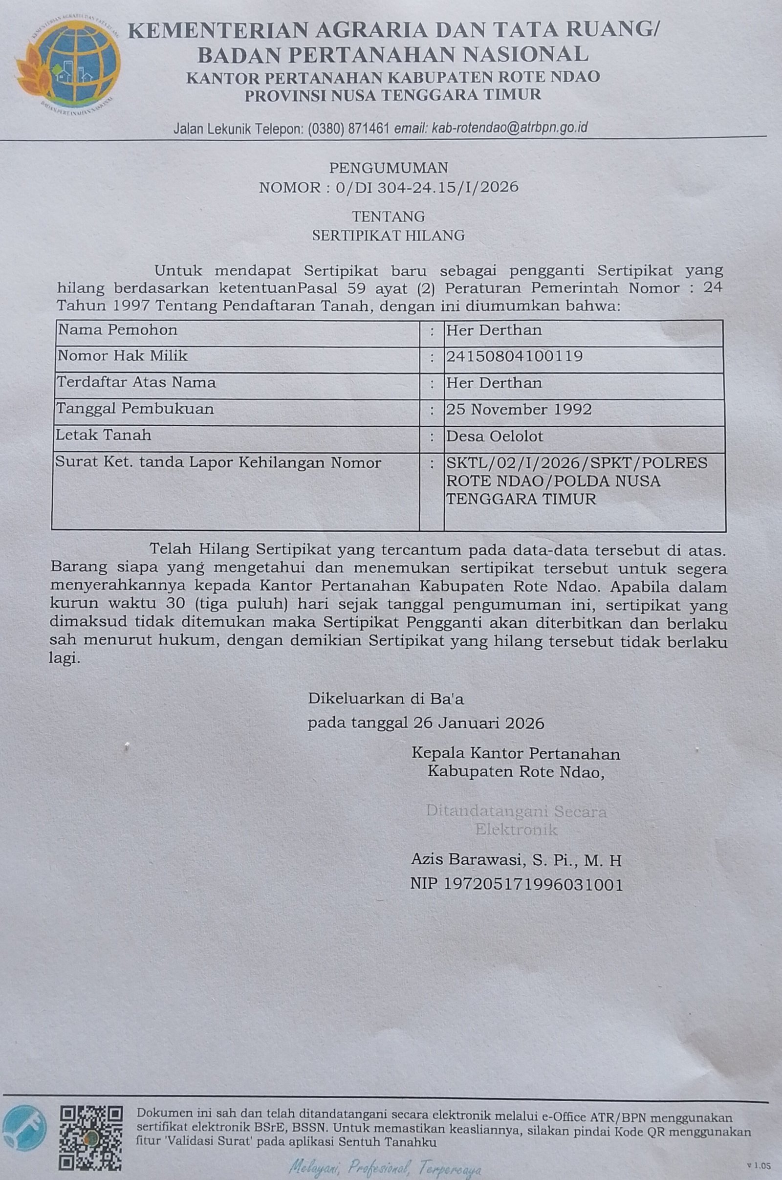 Sertipikat tersebut telah hilang. Barang siapa yang mengetahui atau menemukan sertipikat diminta untuk segera menyerahkannya ke Kantor Pertanahan Kabupaten Rote Ndao. Apabila dalam 30 hari sejak tanggal pengumuman tidak ditemukan, akan diterbitkan Sertipikat Pengganti yang sah menurut hukum, sehingga sertipikat yang hilang tidak berlaku lagi.