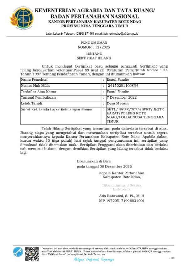 “Kami mengimbau kepada seluruh masyarakat, jika menemukan sertifikat atas nama Bapak Melkianus Lusi dan Bapak Esaul Pandie, mohon dapat segera mengembalikannya ke Kantor Pertanahan Kabupaten Rote Ndao,” ujar Azis Barawasi dalam pengumumannya yang dikeluarkan di Ba’a, 8 Desember 2025.