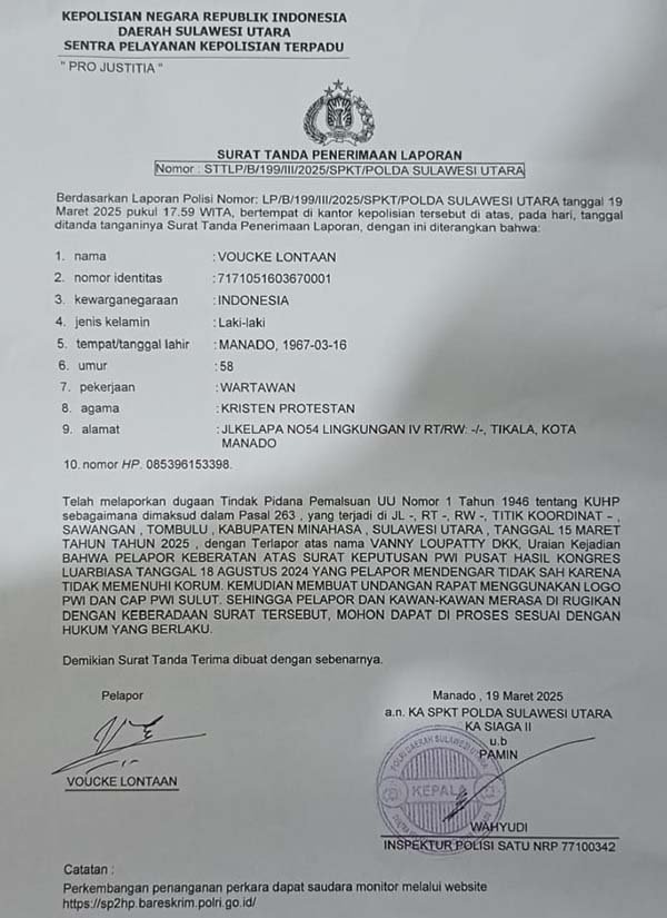 Surat laporan itu ditandatangani Inspektur Polisi Satu Wahyudi. Surat Tanda Penerimaan Laporan bernomor: STTLP/B/199/III/2025/SPKT/Polda Sulawesi Utara.