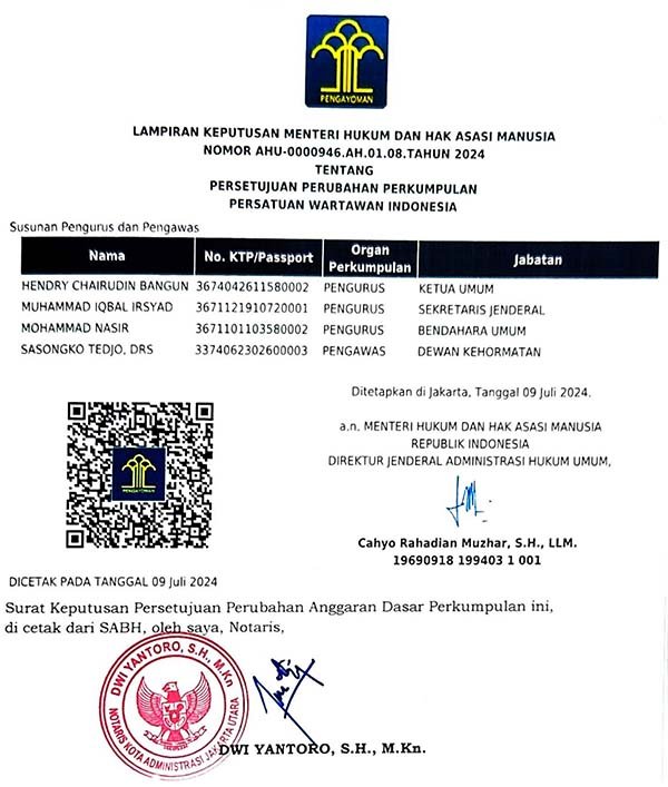 Pengesahan dari Menteri Hukum dan Ham Nomor : AHU-0000946.AH.01.08.Tahun 2024, yang dapat diakses melalui link https://ahu.go.id/sabh/perkumpulan/qrcode/?kode=NjAyNDA3MDkzMTIwMDA3Ml8zXzA5IEp1bGkgMjAyNF8wOSBKdWxpIDIwMjQ=, mengesahkan Hendry Chairudin Bangun sebagai Ketua Umum, “Dialah ketua umum yang sah, tidak ada yang lain” tegasnya.