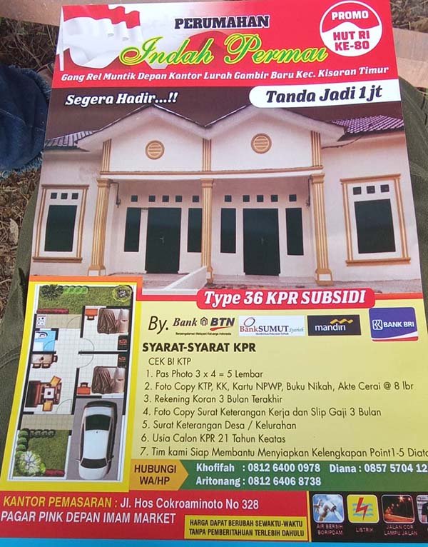 Asahan,Sulutnews.com – Demi mensukseskan Program Presiden Prabowo Subianto mendirikan rumah bersubsidi sebanyak 3 juta unit, pihak Pengembang Perumahan Indah Permai yang berkantor dijalan Cokroaminoto akan membangun Perumahan type 36 KPR Bersubsidi.