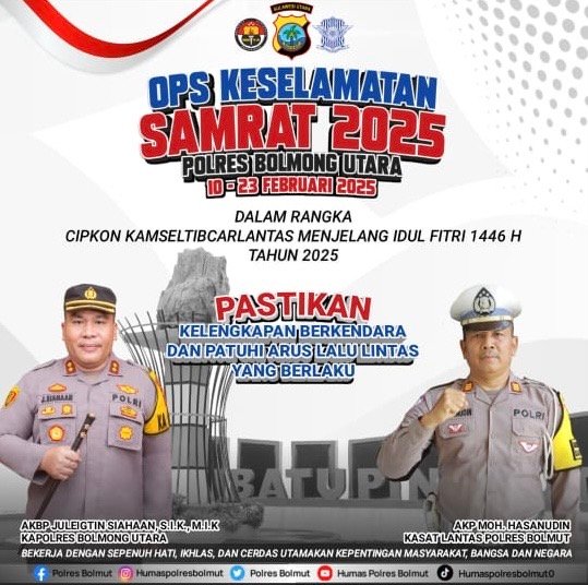 Bahwa dalam rangka terciptanya situasi kamseltibcarlantas yang aman dan nyaman menjelang puasa Ramadhan dan Hari Raya Idul Fitri 1446 serta meningkatkan kedisiplinan masyarakat dalam berlalu lintas. Polres Bolmong Utara dan Jajaran telah menggelar Operasi Keselamatan Samrat tahun 2025.