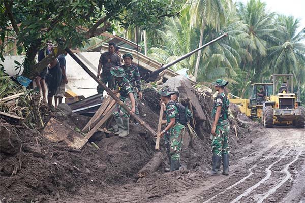 Sinergi antara TNI, Pemda, dan masyarakat terlihat kuat di lapangan. Prajurit Kodam XIII/Merdeka bahu-membahu bersama warga membersihkan sisa material lumpur yang menutup akses jalan dan masuk ke rumah-rumah penduduk.