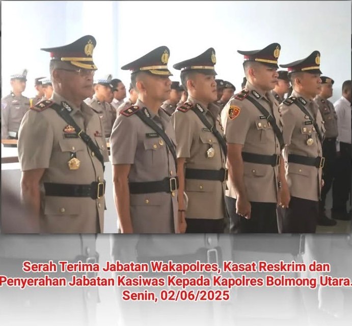 Bolmong Utara, Sulutnews.com – Kepolisian Resor Bolaang Mongondow Utara (Polres Bolmut) melaksanakan upacara serah terima jabatan (Sertijab) dua posisi penting serta pengukuhan Kepala Seksi Pengawasan (Kasiwas), bertempat di halaman Mapolres Bolmong Utara. Senin (02/06/2025).