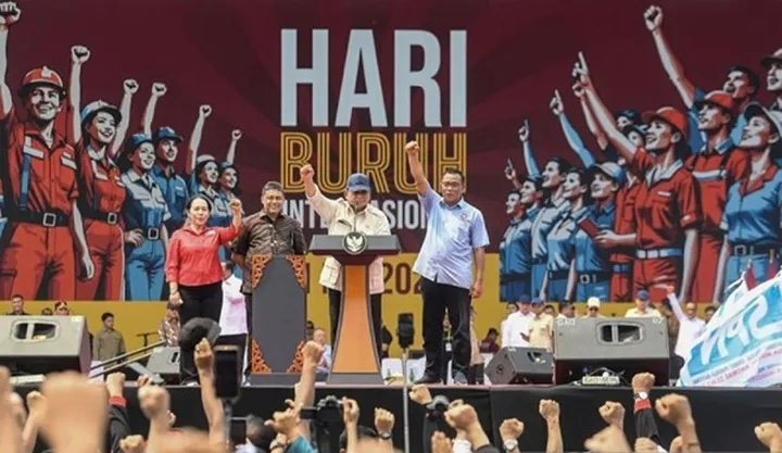 Foto : Presiden Prabowo Subianto (ketiga kiri) didampingi Presiden Konfederasi Serikat Pekerja Indonesia (KSPI) dan Presiden Partai Buruh Said Iqbal (kedua kiri), Presiden Konfederasi Serikat Buruh Seluruh Indonesia (KSBSI) Elly Rosita Silaban (kiri), dan Ketua Umum Konfederasi Serikat Pekerja Seluruh Ind. /Adimaja/ANTARA.