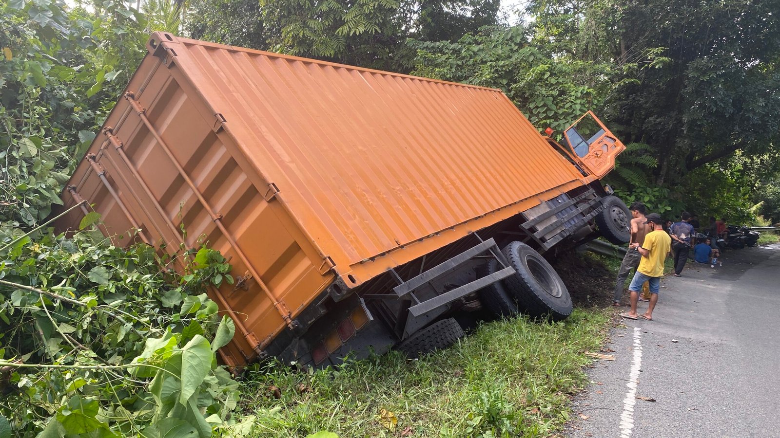 Bolmong Utara, Sulutnews.com – Mobil truck dengan plat kenderaan Makassar DD 8446 KN dengan sopirnya Moh. Ali mengalami kecelakaan menghindar Yamaha Matic DM 3440 SC karena ditikungan tanjakan Wakat, pengendara motor jatuh terpeleset, sopir truck dari arah Manado menghindar tabrakan membanting stirnya ke kiri terperosok nyaris masuk jurang. Kamis (8/1/2025).