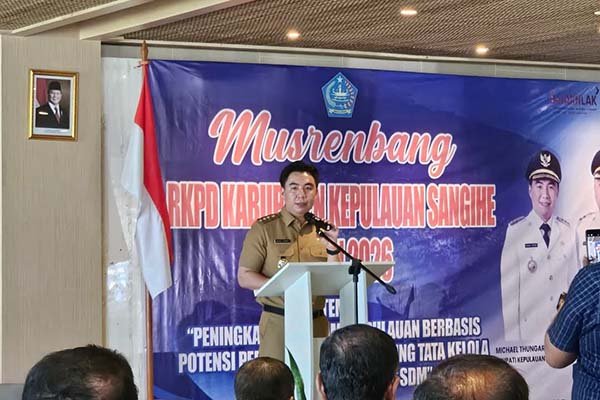 Bupati Kepulauan Sangihe, Michael Thungari menyampaikan sambutannya, ia menegaskan bahwa Musrembang bukan sekedar kegiatan rutinitas pemerintah, melainkan sebuah wadah menyatukan pemikiran untuk bersama membangun Sangihe.