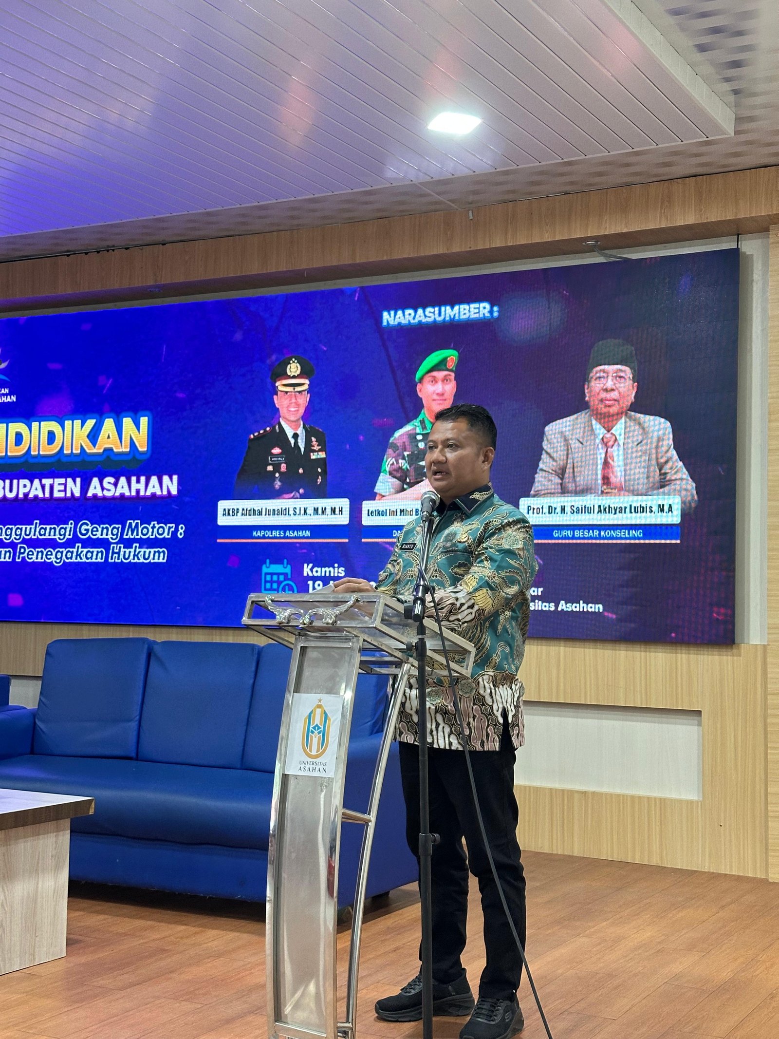 Asahan, sulutnews.com – Wakil Bupati Asahan Rianto, SH., MAP menghadiri acara seminar pendidikan strategi multi pihak dalam menanggulangi geng motor, sinergi pendidikan keluarga dan penegakan hukum di Aula Zulfirman Siregar Universitas Asahan, Kamis (19/06/2025).