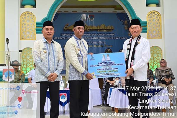 Wakil Gubernur juga dalam kesempatan Safari Ramadhan di Kabupaten Boltim menyerahkan 2.500 kg beras secara gratis kepada warga berkekurangan menghapi Hari Raya Idul Fitri. Bantuan diterima oleh Pemda dan akan disalurkan kepada warga.