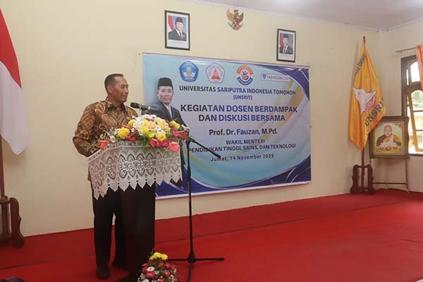 Tomohon,Sulutnews.com – Wakil Walikota Tomohon, Sendy G. A. Rumajar, S.E., M.I.Kom, menerima kunjungan Wakil Menteri Pendidikan Tinggi, Sains, dan Teknologi Republik Indonesia, Prof. Dr. Fauzan, M.Pd, bersama rombongan di Universitas Sariputra Indonesia Tomohon (Unsrit), Jumat (14/11/2025).