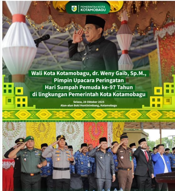 KOTAMOBAGU – Wali Kota Kotamobagu, dr. Weny Gaib, Sp.M., memimpin upacara peringatan Hari Sumpah Pemuda ke-97 Tahun 2025 yang digelar di Alun-alun Boki Hotinimbang Kotamobagu, Selasa (28/10/2025).