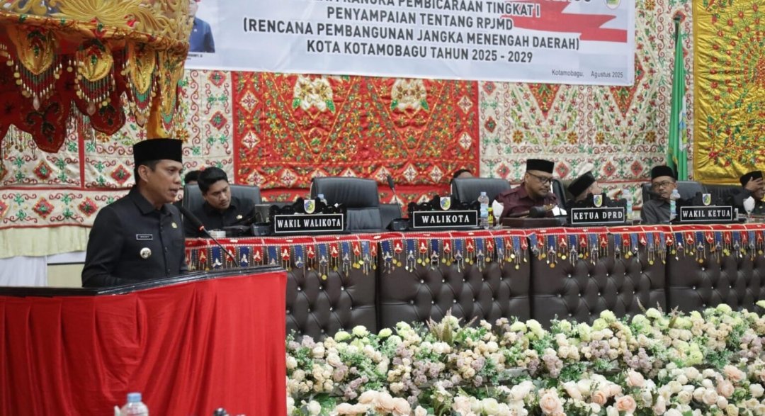 KOTAMOBAGU – Wali Kota Kotamobagu, dr. Weny Gaib, Sp.M., menyampaikan Rancangan Peraturan Daerah (Ranperda) tentang Rencana Pembangunan Jangka Menengah Daerah (RPJMD) Kota Kotamobagu Tahun 2025–2029 pada Rapat Paripurna DPRD Kota Kotamobagu, di Gedung DPRD Kota Kotamobagu, pada Jumat (15/08/2025).