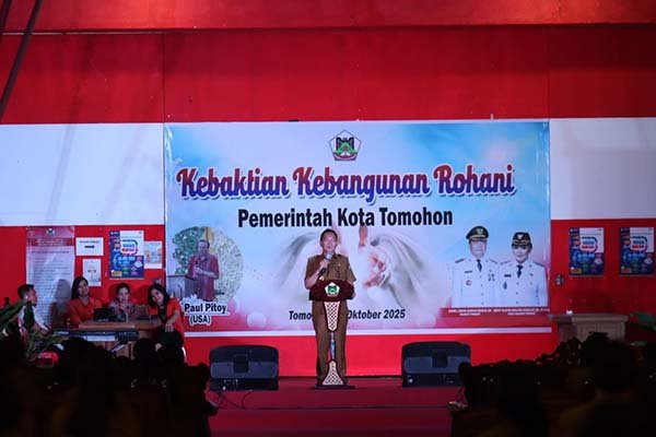 Tomohon,Sulutnews.com – Walikota Tomohon Caroll J. A. Senduk, S.H. didampingi Ketua TP-PKK Kota Tomohon drg. Jeand’arc Senduk-Karundeng dan Wakil Walikota Tomohon Sendy G. A. Rumajar, S.E., M.I.Kom. mengikuti Ibadah Kebaktian Kebangunan Rohani (KKR) Pemerintah Kota Tomohon, Senin, 20 Oktober 2025.